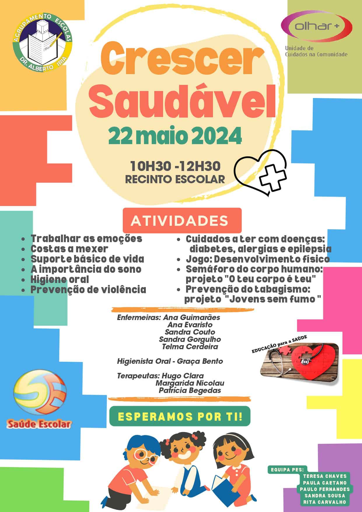 No próximo dia 22/05/2024 das 10h30 às 12h30, na Escola Alberto Iria, no âmbito da Educação para a Saúde e do projeto “Crescer Saudável”, projeto de articulação com a UCC Olhar+ do Centro de Saúde de Olhão, decorrerão atividades dinamizadas por 5 enfermeiras, 1 Higienista Oral, 3 terapeutas e a equipa PES destinadas a toda a comunidade escolar, incluindo os encarregados de educação que poderão deslocar-se à Escola para também tomarem conhecimento do que é feito a nível da Saúde Escolar no Agrupamento.