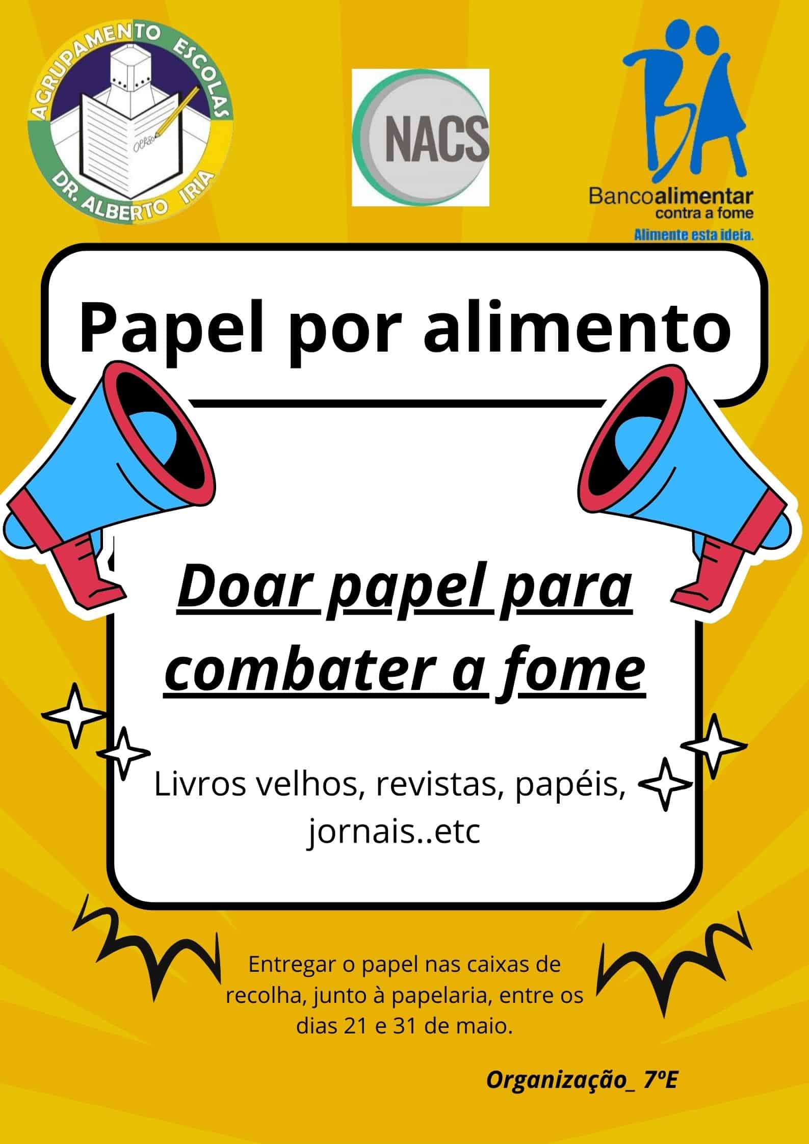 No âmbito do domínio do voluntariado de Cidadania e Desenvolvimento, a turma do 7ºE está a organizar uma campanha de recolha de papel para posteriormente ser trocado por alimentos.