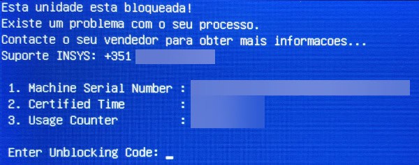 Quando o equipamento é bloqueado surge uma imagem semelhante à seguinte:
