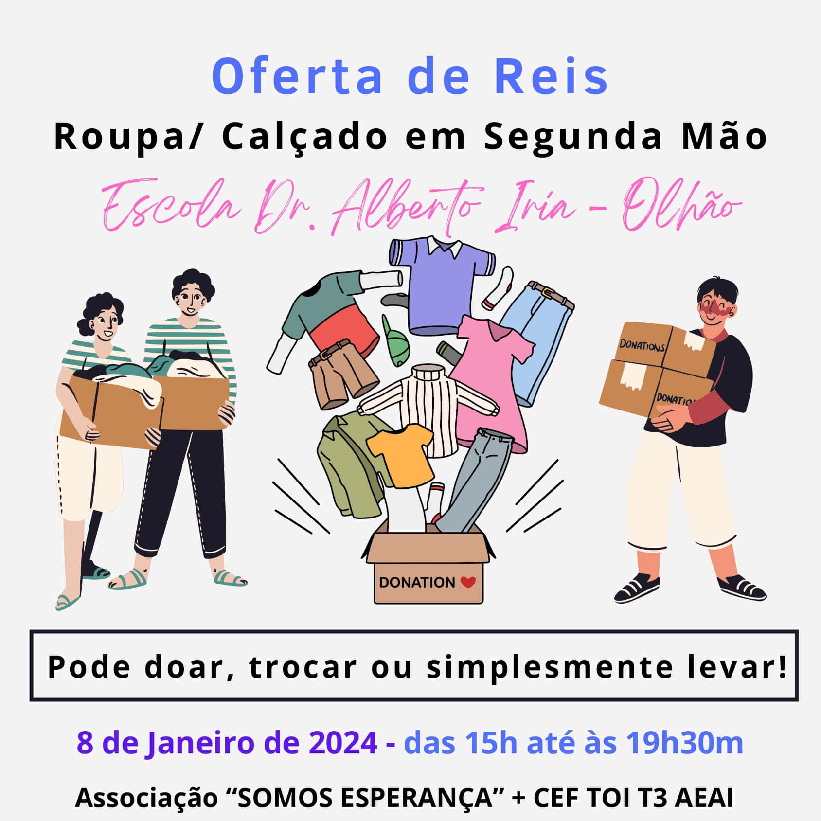 Na próxima segunda-feira, dia 8 de janeiro, a partir das 15 horas e até às 19 horas 30 minutos, vai realizar-se uma “feirinha” Oferta de Reis em parceria com a Associação “Somos Esperança”, na qual se convida a comunidade escolar a participar.