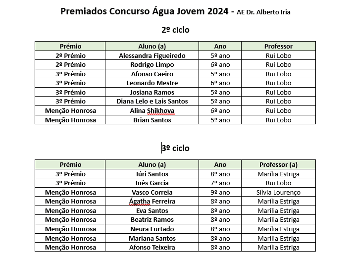 Mais uma vez, o nosso Agrupamento está de parabéns! No Concurso Água Jovem 2024, os nossos alunos, de 2º e 3º ciclos, foram premiados com um total de dois 2º prémios, seis 3º prémios e nove Menções Honrosas. Para além dos prémios que cada aluno vai receber, no próximo ano escolar todos os premiados poderão realizar visitas e ações de monitorização e valorização ambiental a ecossistemas ribeirinhos e ou ecossistemas costeiros, acompanhados pela equipa da APA-ARH Algarve, no âmbito do Programa de Voluntariado Ambiental para a Água.